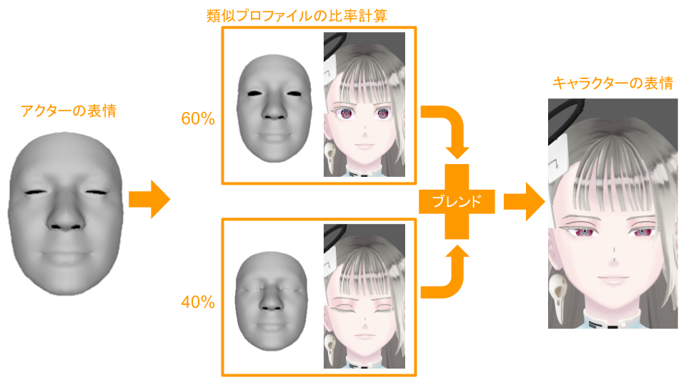 最後にアクターの表情をキャラクターの表情に変換してアニメーションを出力します。この変換プロセスの説明はあくまでイメージであり、実際の計算とは異なる場合があります。 まず、ここまでの工程で得られるアクターの表情に対して、類似するプロファイルを選出しその比率を計算します。その後、それぞれのプロファイルに対応したキャラクターの表情を、計算された比率に応じてブレンドすることで、アクターの表情をキャラクターの表情へと変換します。