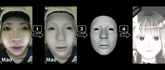 Finally, the actor’s facial expressions are converted into the character’s facial expressions, and the animation is output. The figure below illustrates a general overview of conversion process, but this is an conceptual image, and may differ from actual calculation.