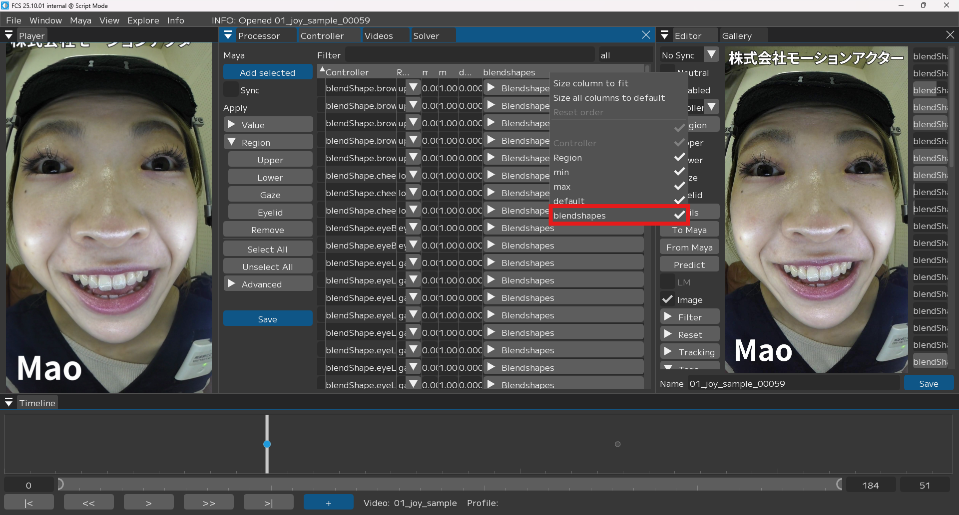 In Controller window, right-click the header of Controller table to display the context menu. Then, enable the “blendshapes” setting and select the blendshapes for the controller. Once settings are complete, click the “Save” button to save them.
