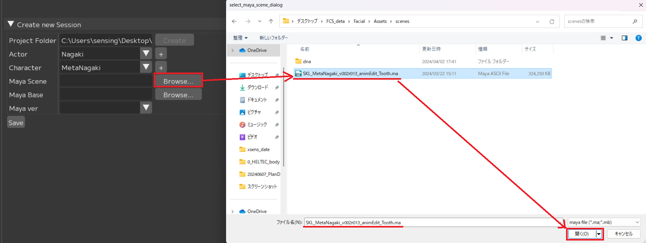 In FCS, a file that links actor information, character information, Maya scene information, and analysis data is called a “Session.”