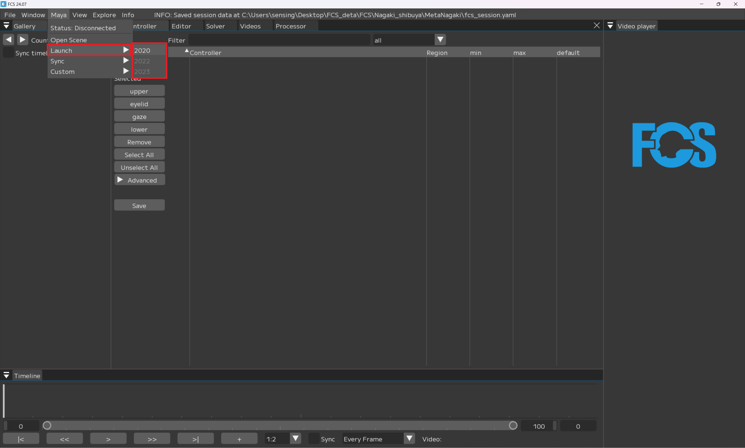 FCSとMayaを接続するためには、必ずFCSのメニューからMayaを起動する必要があります。