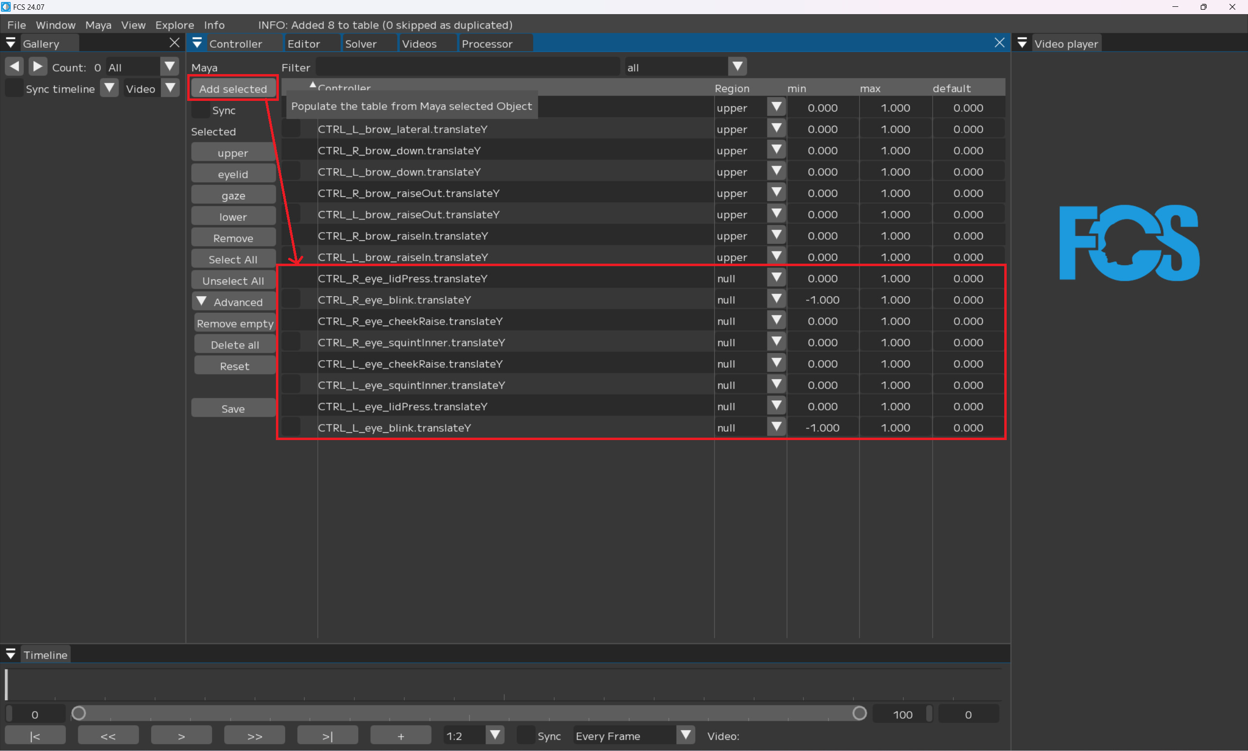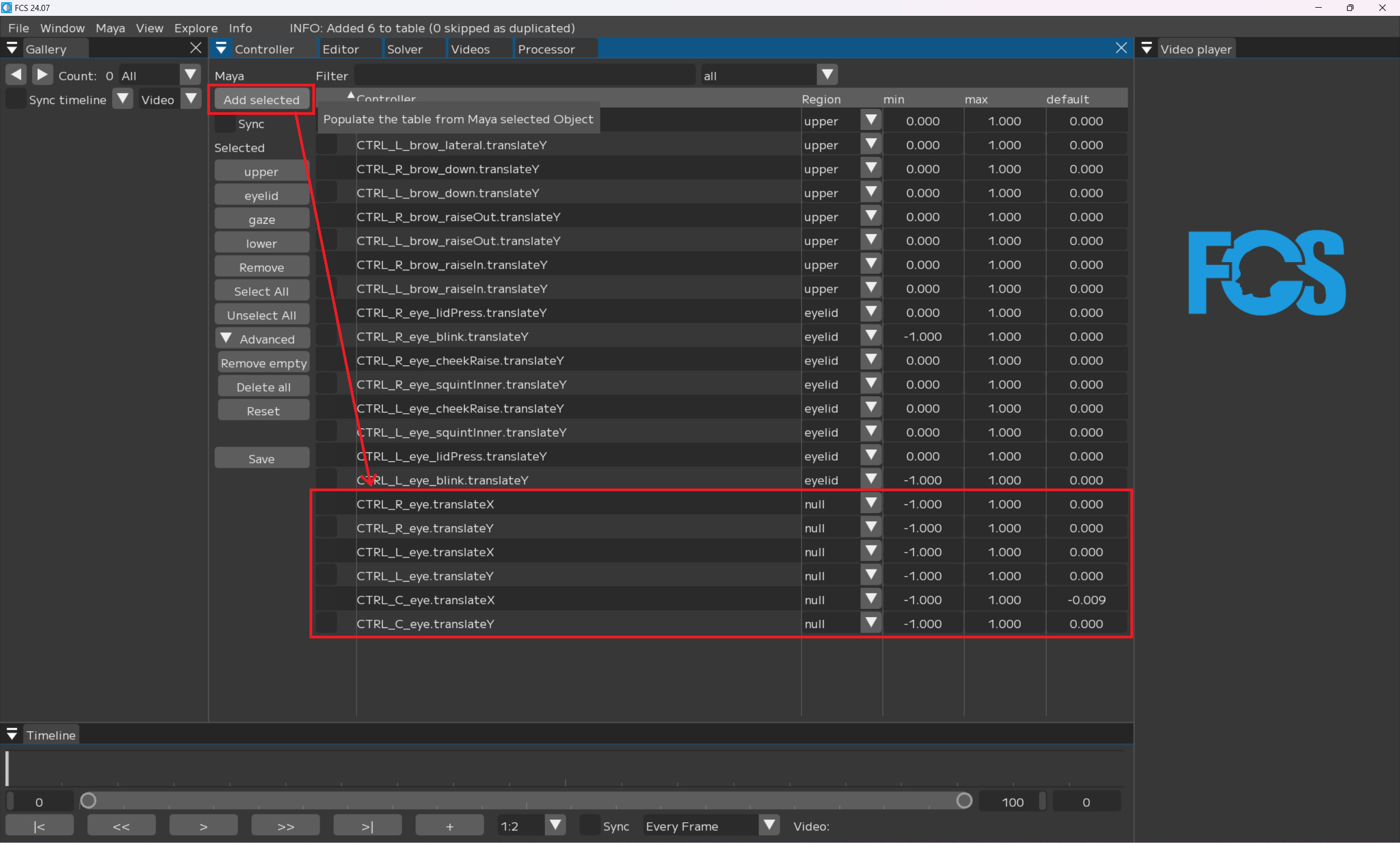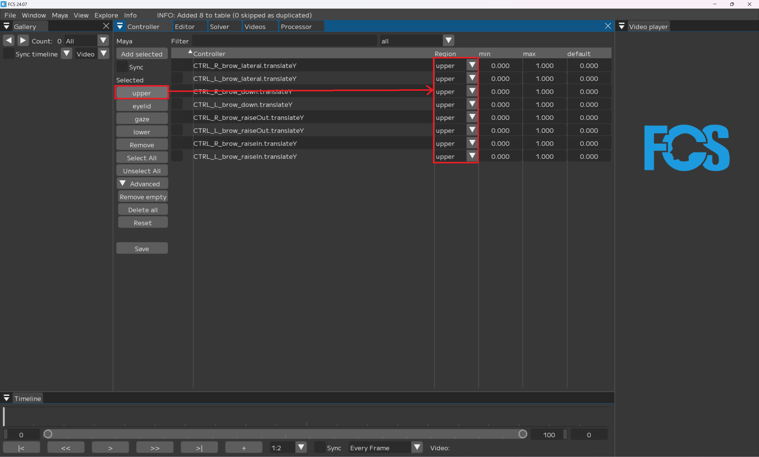 • Upper/Eyelid/Gaze/Lower:Region 部位の区分ごとにコントローラーを登録