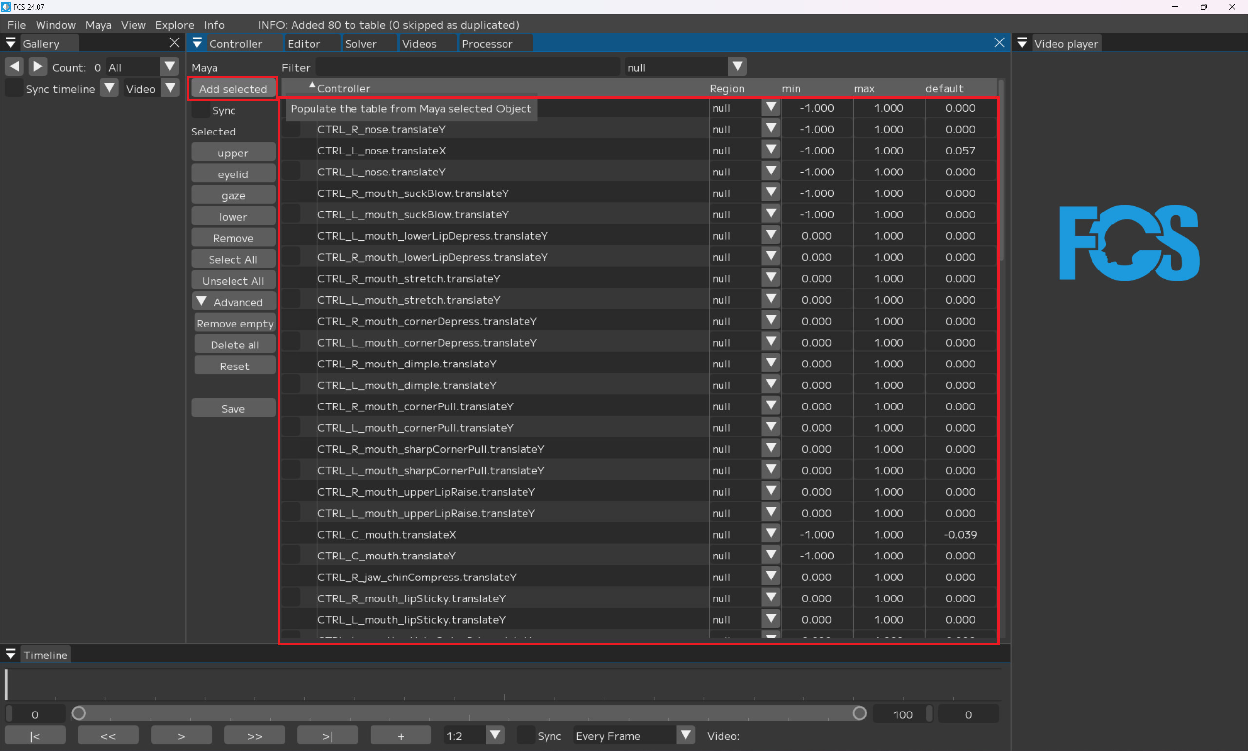 Mayaで選択したコントローラーが「Controller」に表示されるので