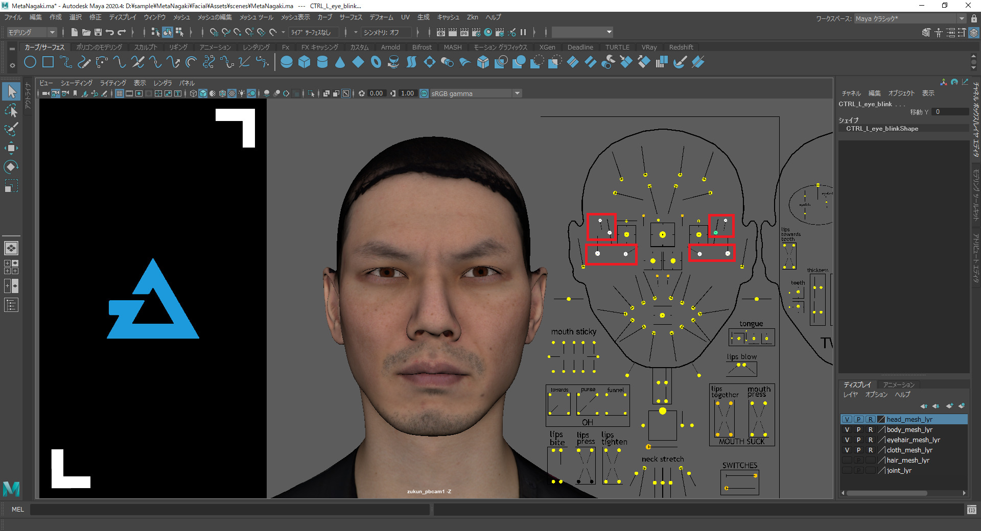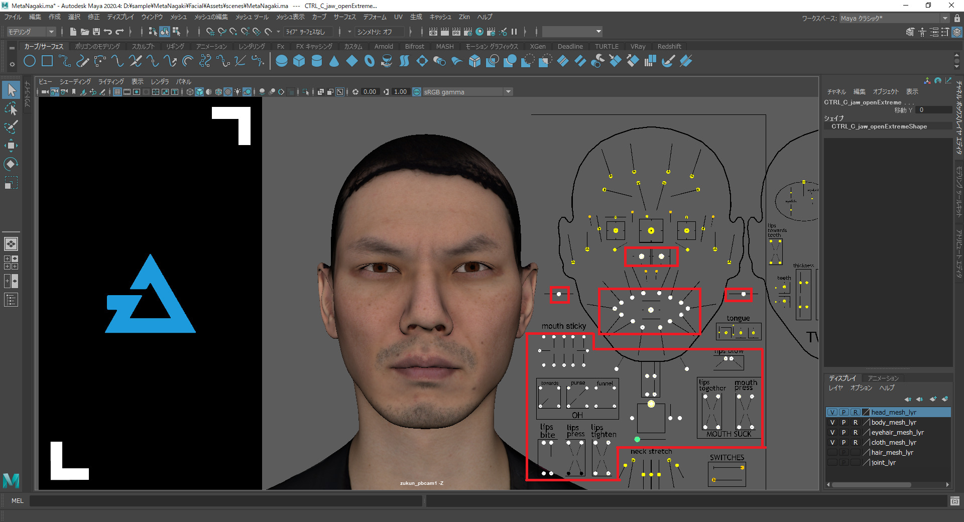 本マニュアルでは、UnrealEngineのMetahumanを使用していますが、別の3DCG作成ソフトで作成したものでも、各部位に連携できるコントローラーリグがあれば対応可能です。また、必要最低限のコントローラーのみを登録していますので、任意で登録するコントローラーを増やすことができます。