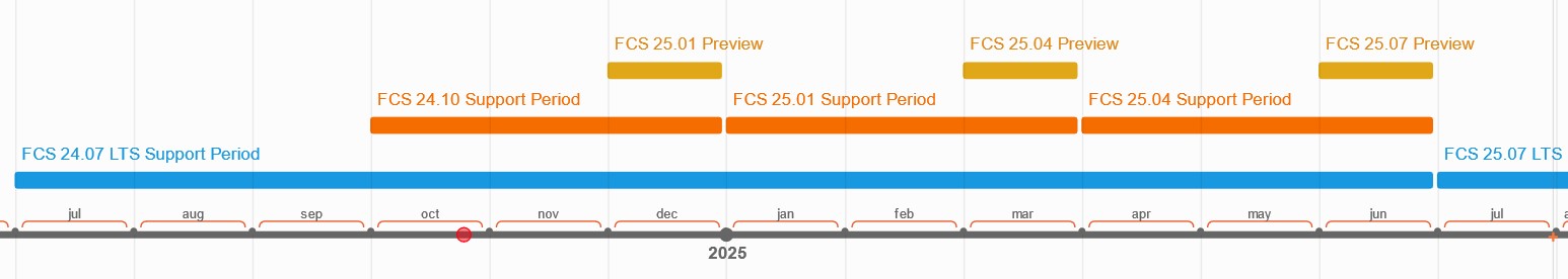 FCSは、1月、4月、7月、10月の各四半期にリリースされます。各メジャーバージョンは、スタンダード版の場合は3ヶ月間、LTS版(長期サポート版)の場合は1年間サポートされます。また、一度リリースされたメジャーバージョンには、バグ修正のためのマイナーバージョンアップデート(例:24.07.02~)以外の更新は行われません。