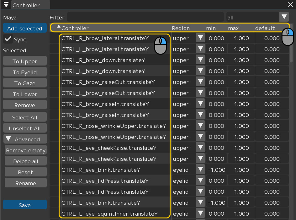 コントローラのアトリビュートがupper / lower / eye / eyelidのどれに該当するかの情報