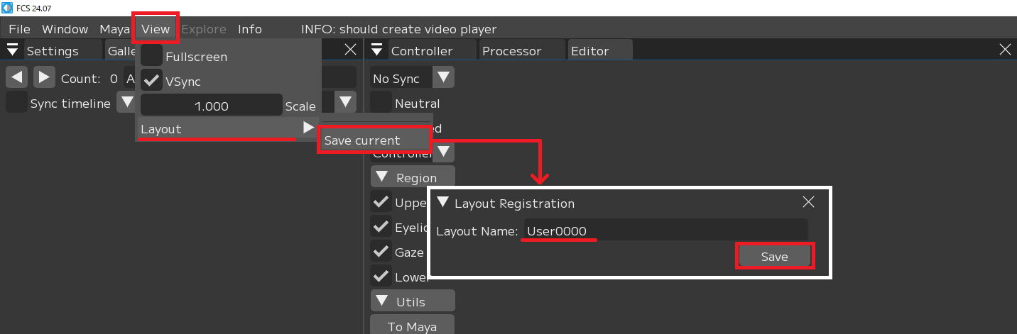 View→Layout→Save current で 「Layout Registration」ウィンドウを起動