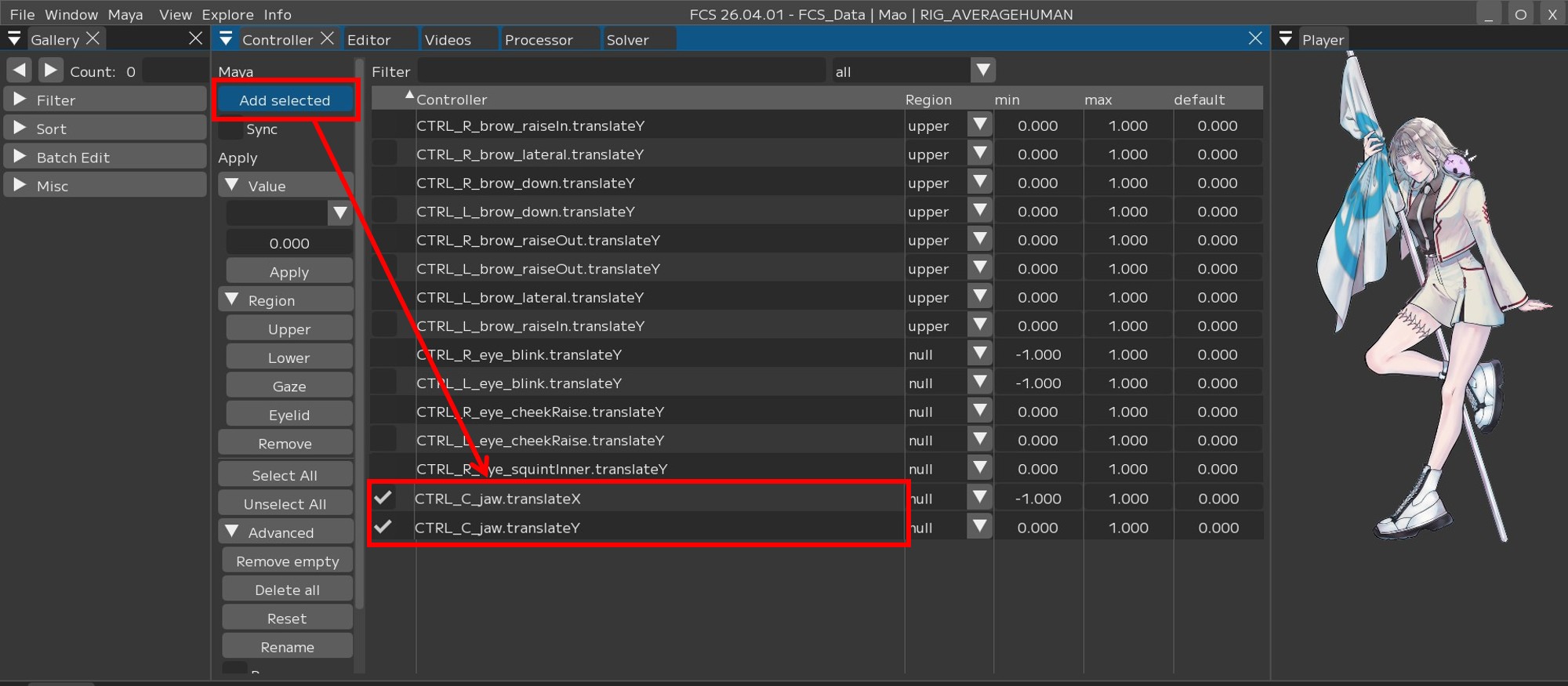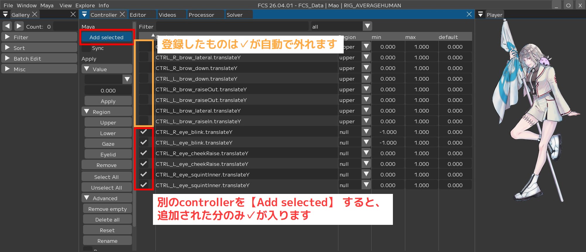 When you select controllers in Maya and execute [Add selected], the selected controllers are added to “Controller” and automatically checked.