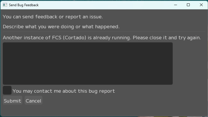 If FCS crashes or an error occurs during use, you can submit a report from the displayed UI.