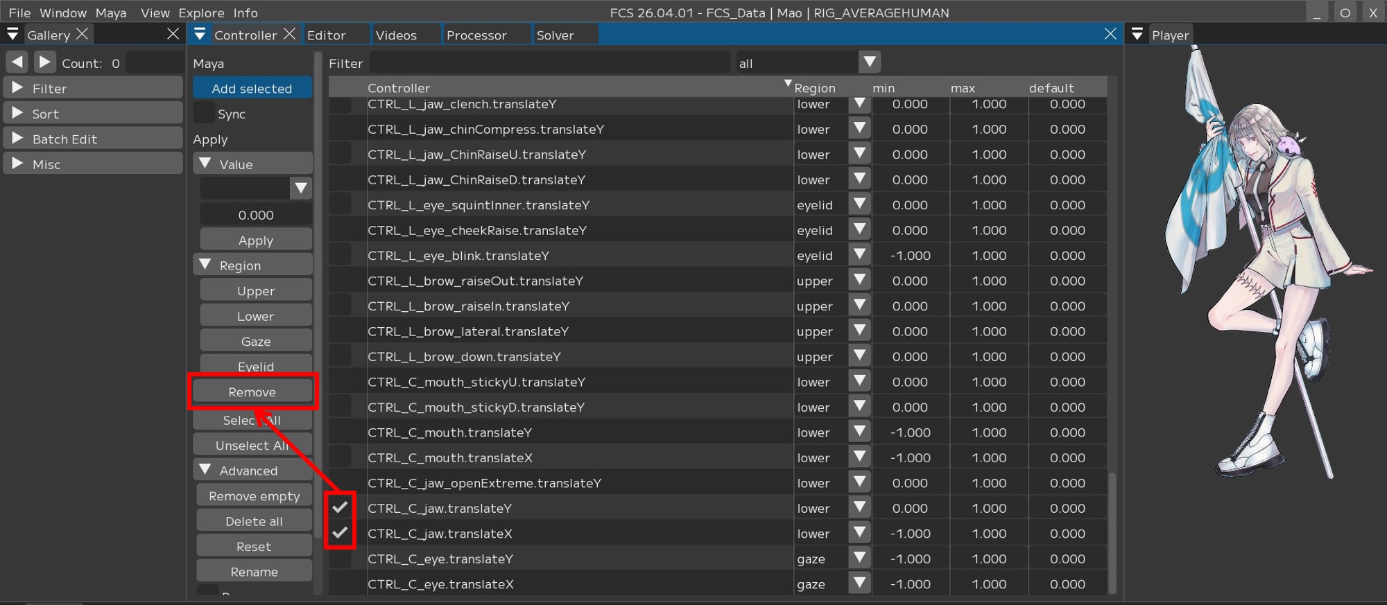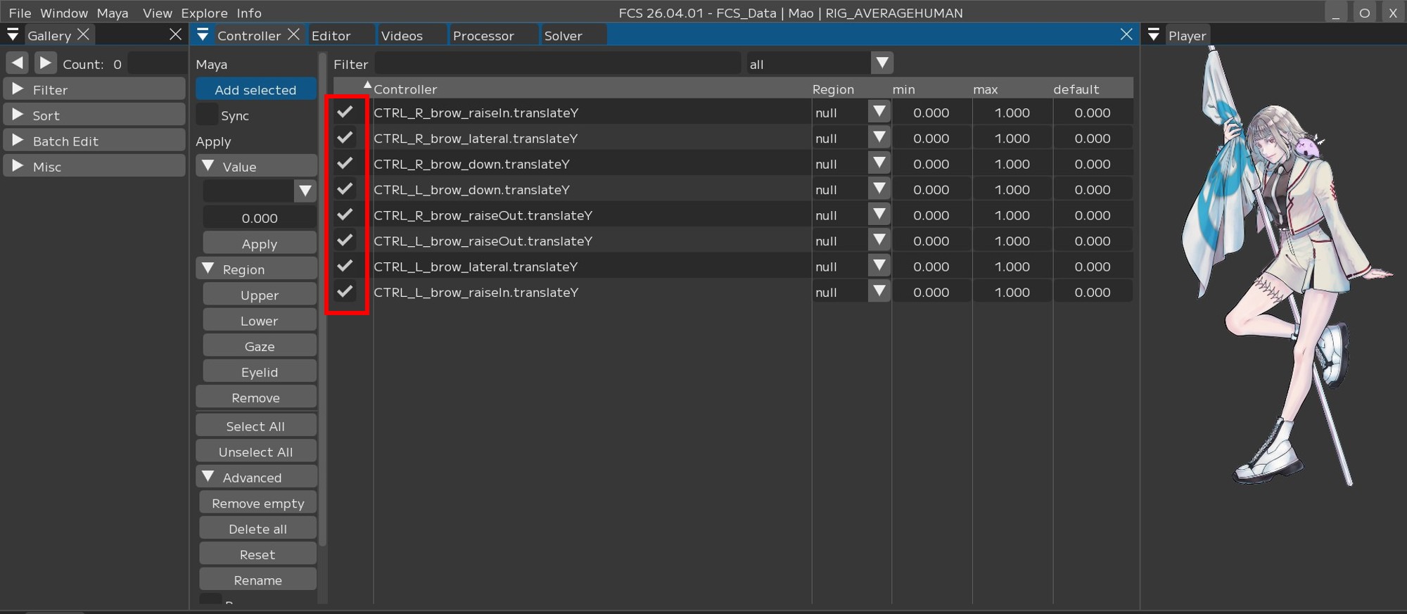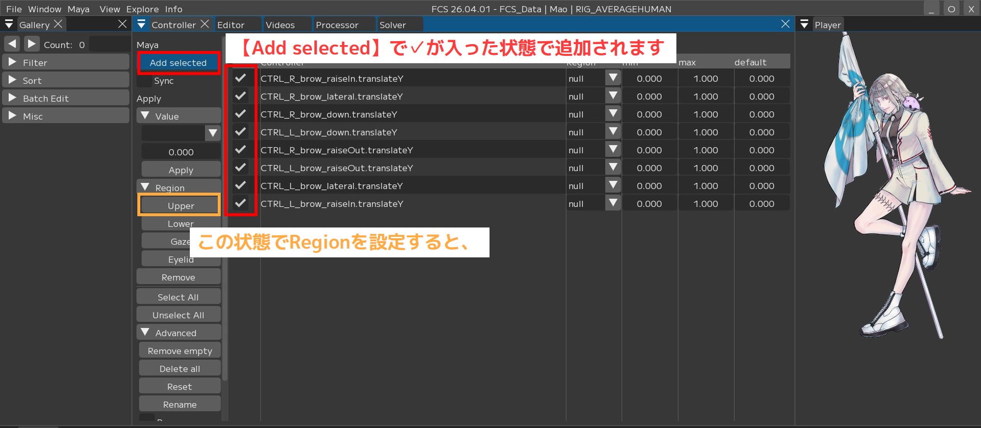 同じ手順で他のRegion(Eyelid/Gaze/lower)も設定してください。