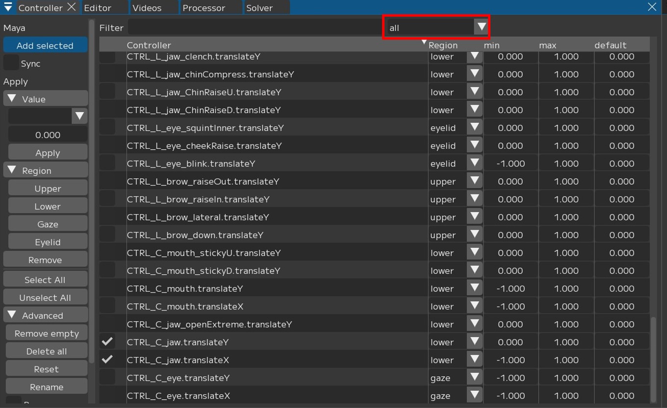 controllerウィンドウでは、Regionの種類や登録の有無でフィルターをかけ表示を絞り込むことができます。