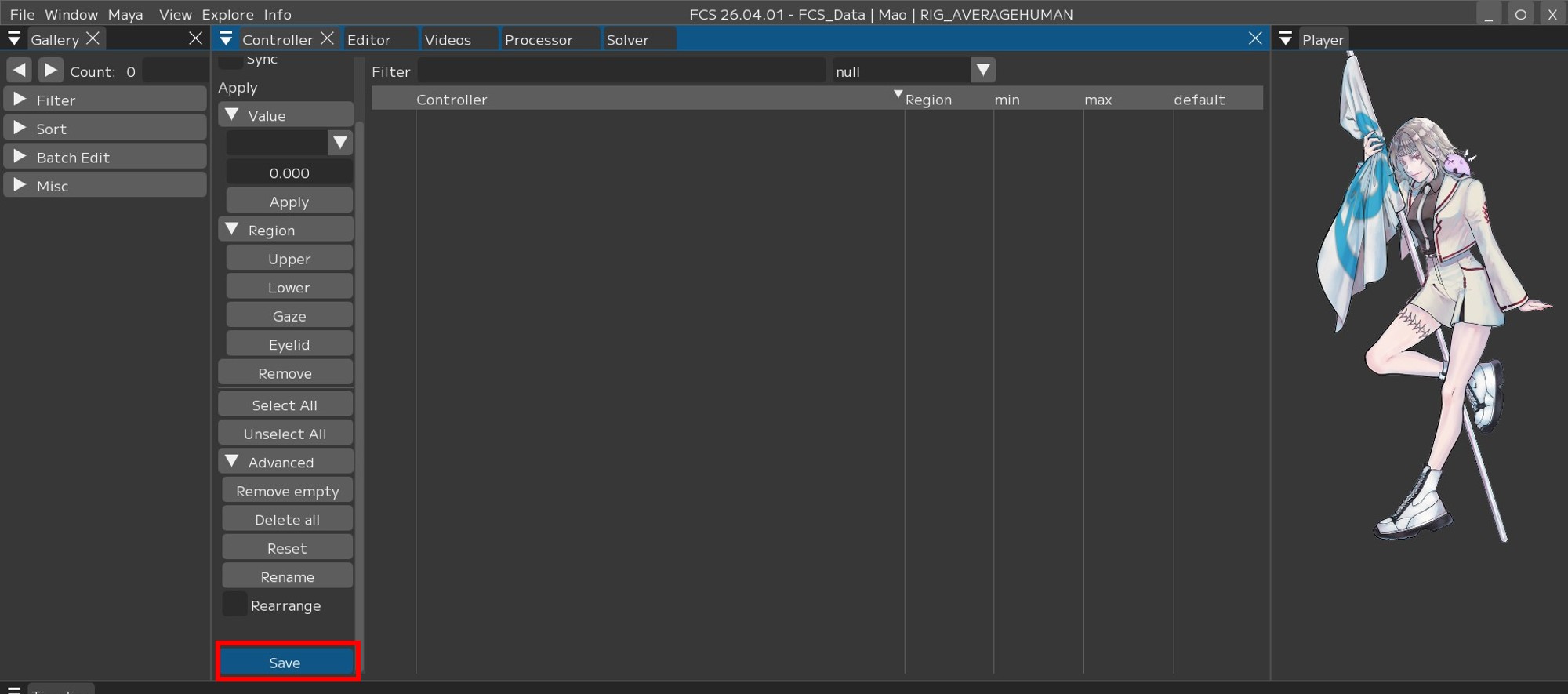 Contollerウィンドウでは、接続しているMayaSceneのコントローラーリグを登録することができます。