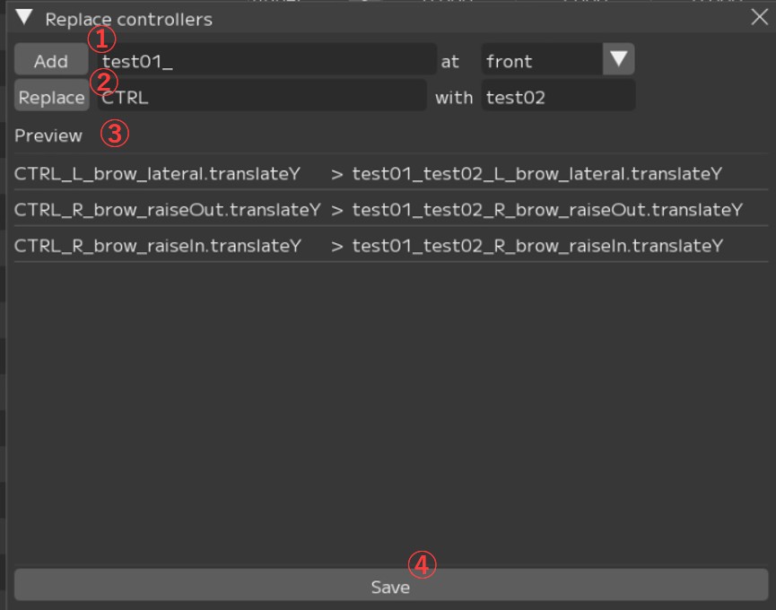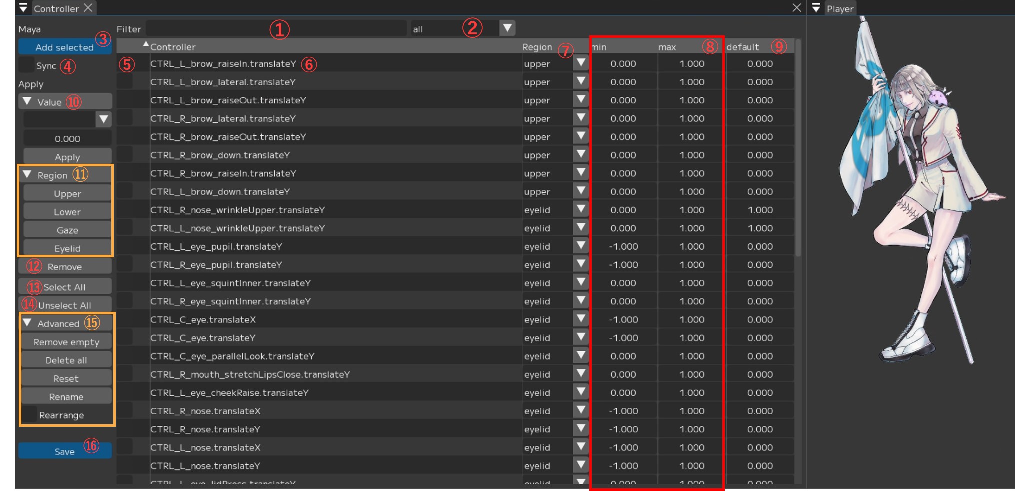 ③ Maya/Add selected:Maya上で選択したコントローラーを登録