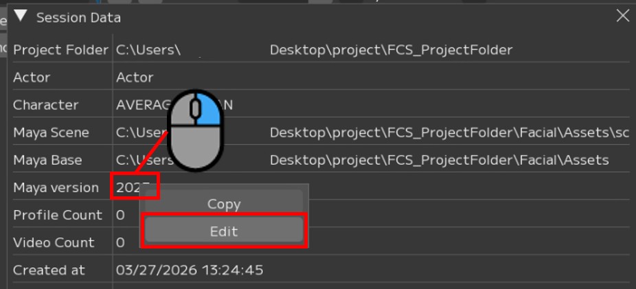 New Sessionで設定したMayaVerがinfoで反映されていない場合は、info画面のMaya Versionを右クリックし、Editから変更ができます。
