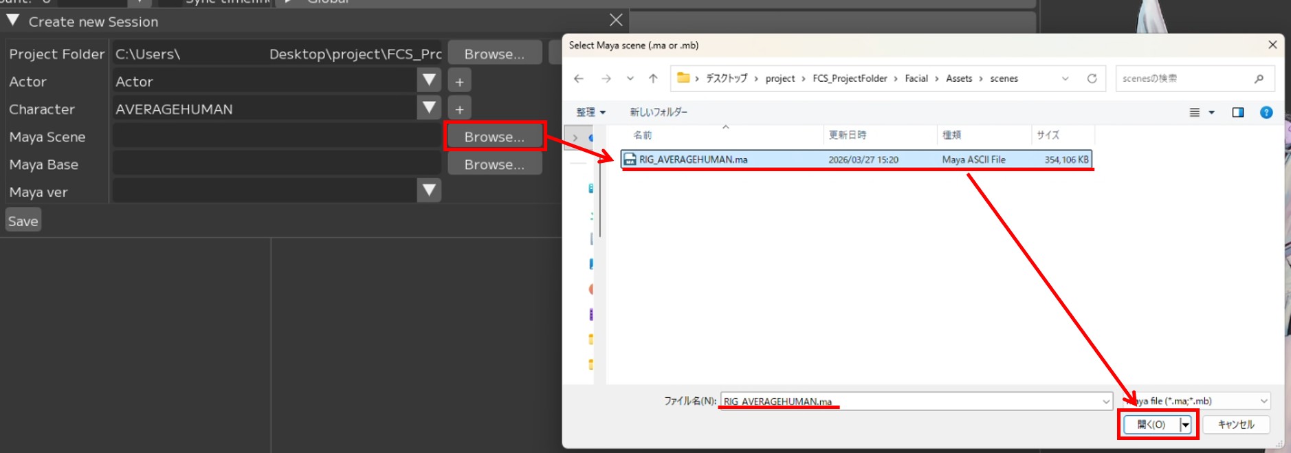 【Browse】をクリックし、MayaSceneを指定するためウィンドウを起動します。