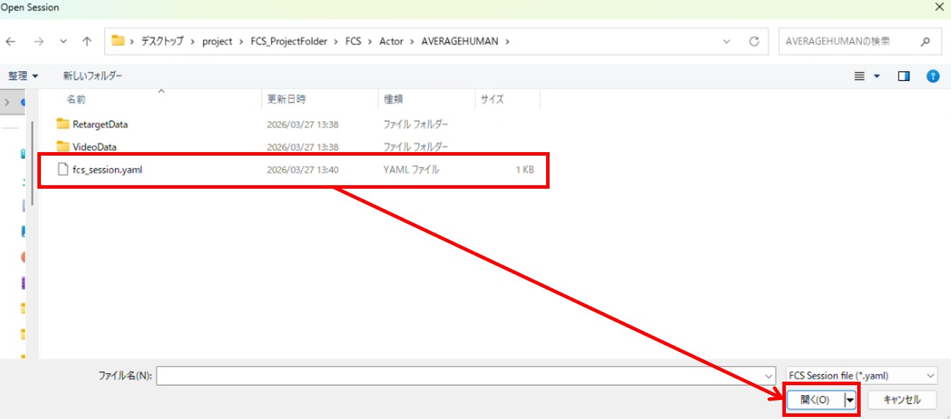OpenSessionウィンドウが開かれたらローカルとネットワークドライブが表示されます。Characterフォルダ直下にあるfcs_session.yamlファイルを選択し、開いてください。