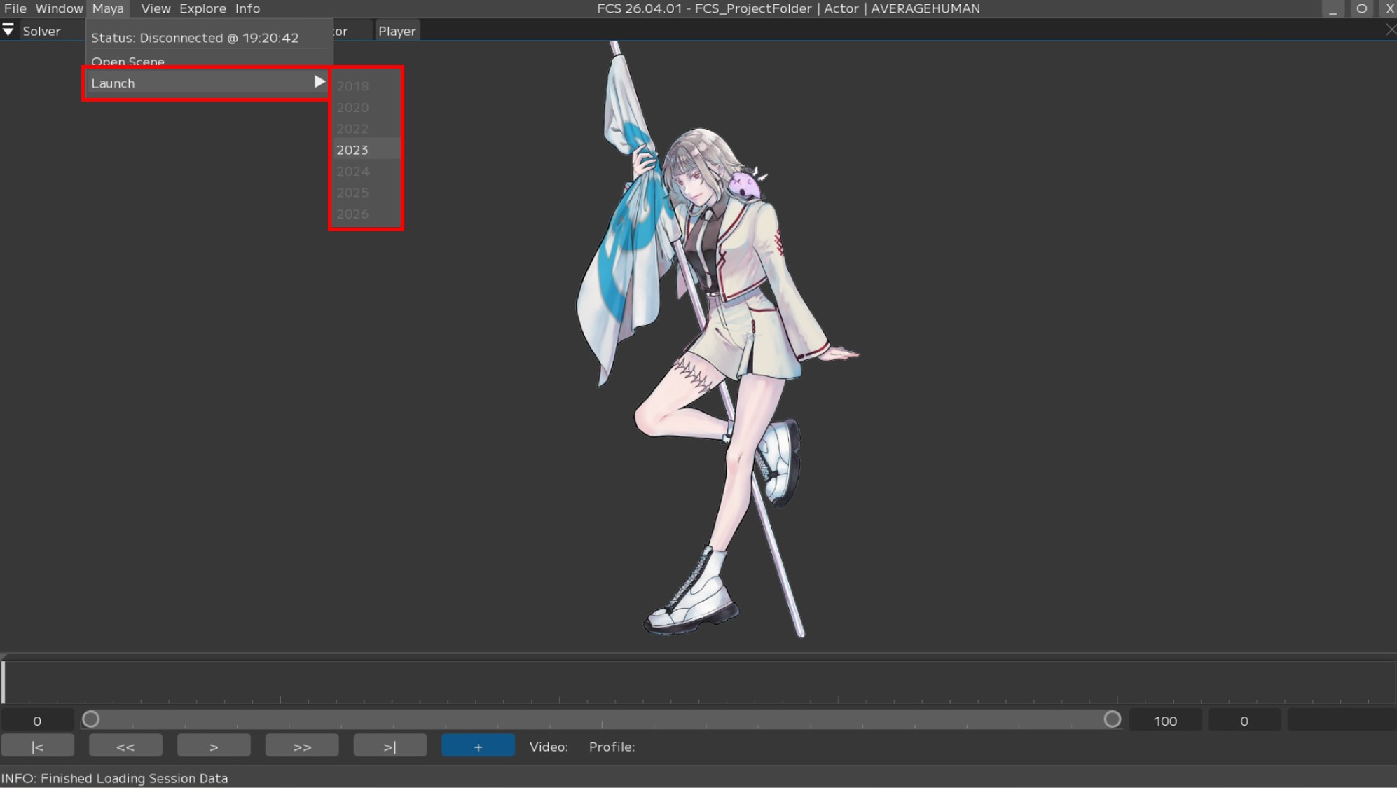 FCSとMayaを接続するためには、必ずFCSのメニューからMayaを起動する必要があります。