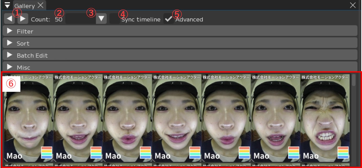 ① Filter入力欄:動画名で絞り込み