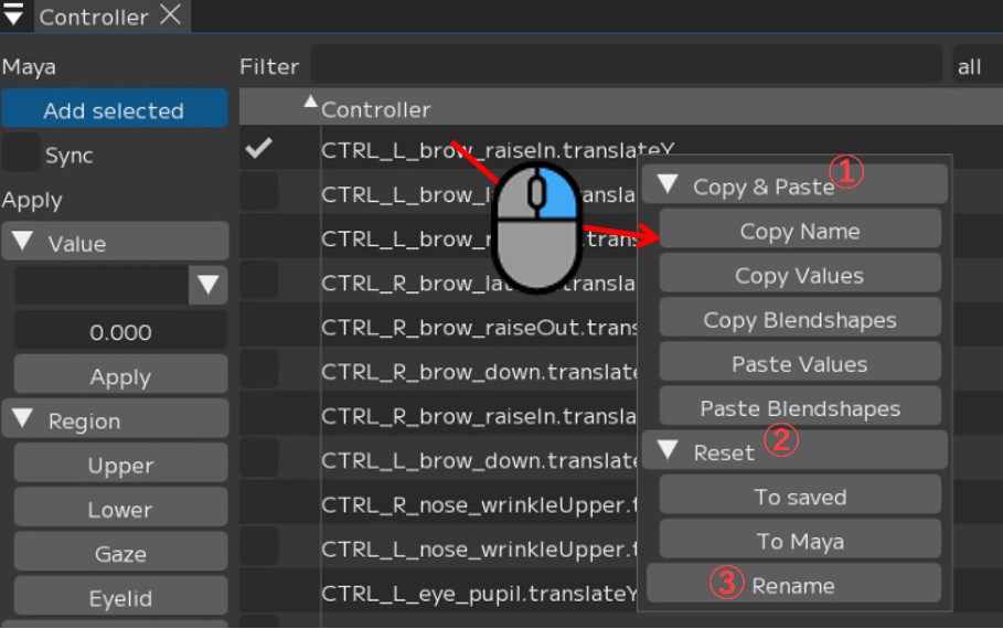 ③ Maya/Add selected:Maya上で選択したコントローラーを登録