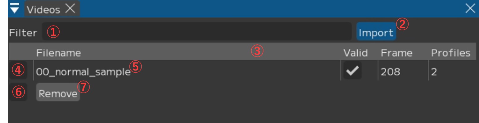 Videosウィンドウでは読み込んだHMC動画を一覧で表示します。