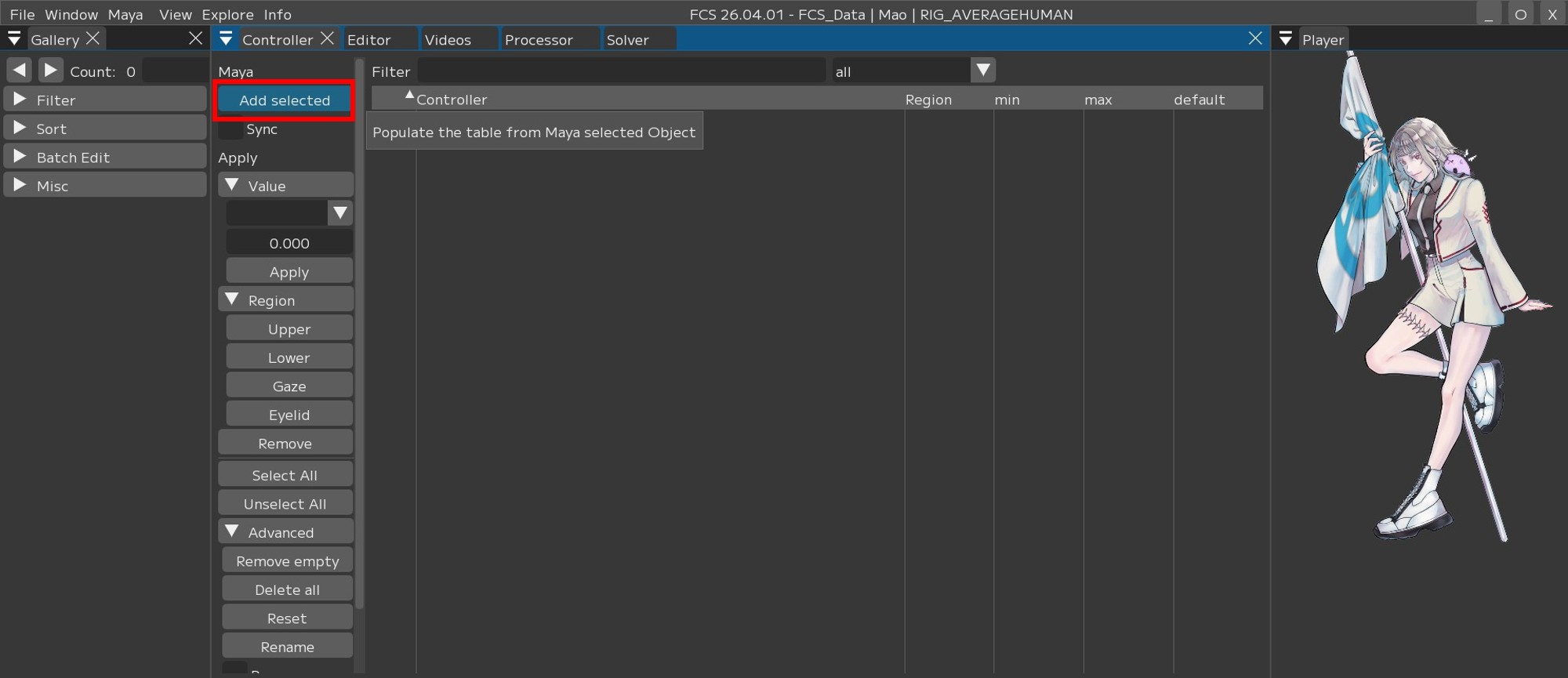 Contollerウィンドウでは、接続しているMayaSceneのコントローラーリグを登録することができます。