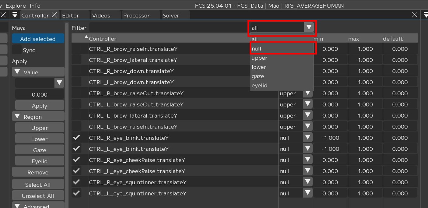 controllerウィンドウでは、Regionの種類や登録の有無でフィルターをかけ表示を絞り込むことができます。