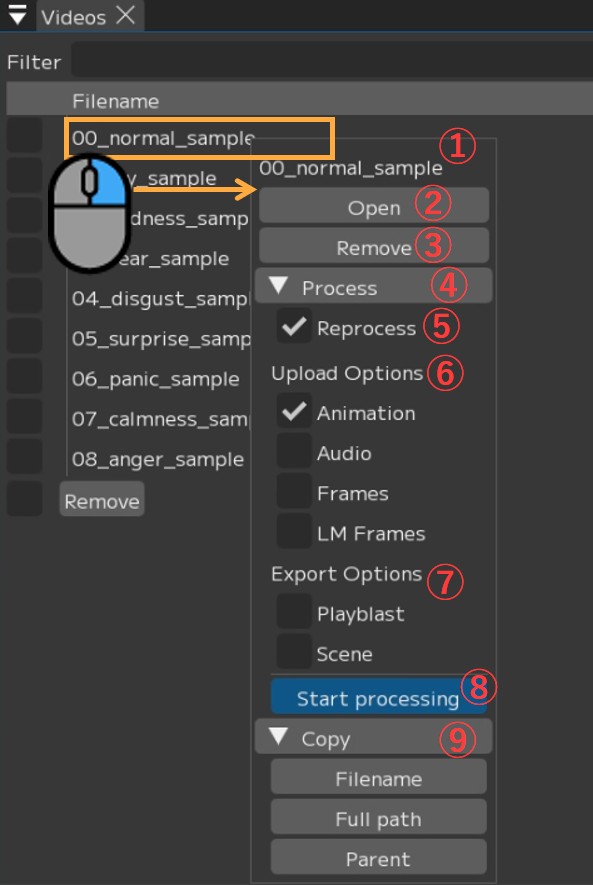 Videosウィンドウでは読み込んだHMC動画を一覧で表示します。